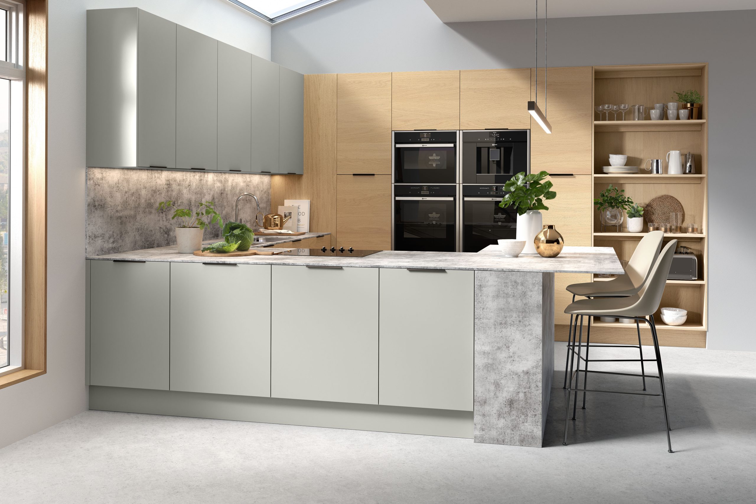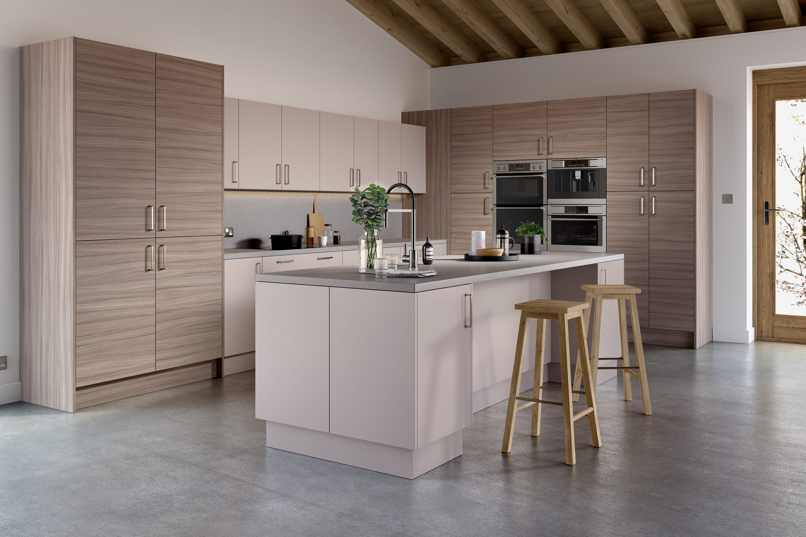 A strikingly simple kitchen design featuring clean, understated slab doors in a warm woodgrain-effect finish.
