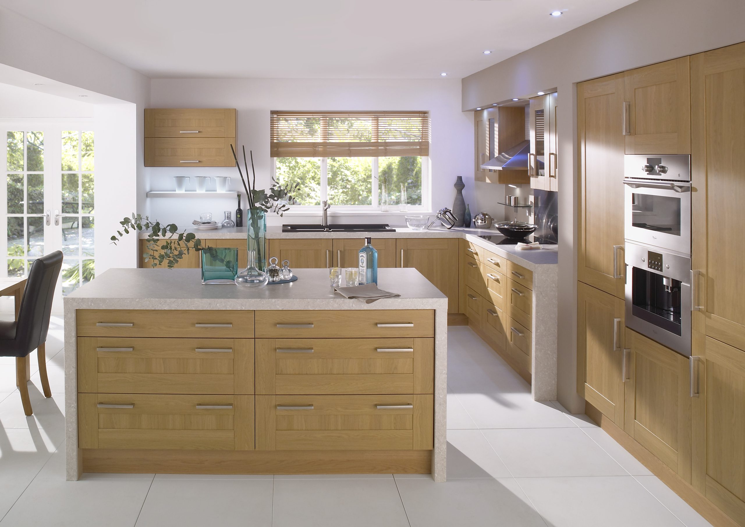 An attractive, versatile Shaker kitchen featuring a striking five-piece door design in a stylish ivory wood-grain effect finish.